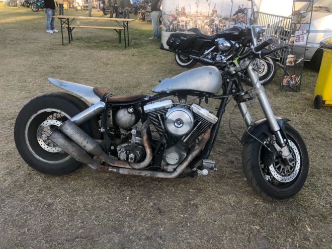 Aufgestanden, ohh, neue Nachbarn mit Harleys, die ick als meine Traummopeds bezeichnen könnte. “Ratten“-Kustoms, eine mit einer Gabel, die man wirklich als l a n g bezeichnen kann und mehr oder weniger alles selbst zurecht gezimmert. No Bolt on!!!