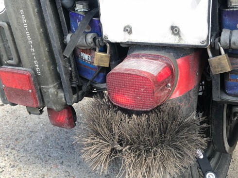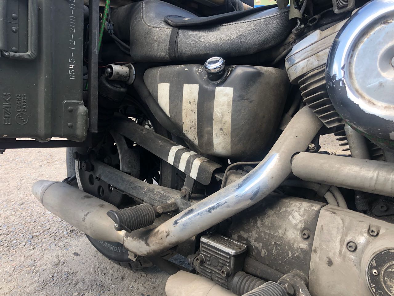 Der Zustand der zu befahrenden Teilstücke der Baustellen wird immer schlimmmmmmer. Mit Starrahmen, Springergabel, Suizidclutch und Autoreifen hinten, wäre es  n i c h t  machbar. Für 300 m braucht man bei unter Schrittgeschwindigkeit an Zeit???? Auch sehr scharfkantige „Felsbrocken“ müssen überwunden werden. Teststrecke für Öhlins 4×4 Dämpfer ?????
