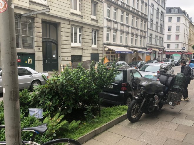 Heute am Mittwoch beginnt der Tag wieder mit Regen, leichter Nieselregen. Egal, sind ja nur noch ca. 550 km bis Berlin. Kurz nach Abfahrt in Vejle hört es mit dem Wasser von oben auf. In Hamburg angekommen, kurz mal ein Abstecher zum Clubkameraden machen. Ab zu Single and Twins, Nööö, Laden ist rammeldicht, kein Jörg da. Naja, wenn die Harley Armada anrückt, verdrücken sich die Briten……