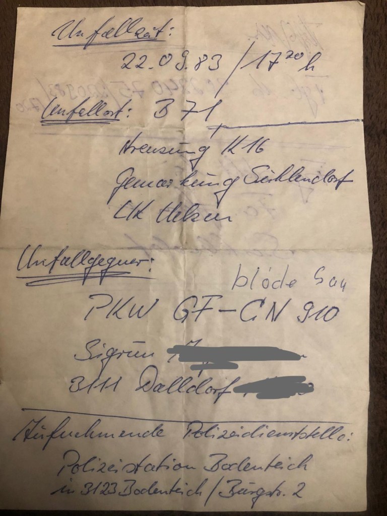 Zumindest hat die gegnerische Versicherung gezahlt! Also bin / war ick schuldlos…. Bin der Meinung ick kam aus Richtung Soltendieck, heute steht da aber das achteckige Stopschild…. oder kam ick doch aus Richtung Uelzen damals ??? O D E R ? ! Ick soll den Passat um 90° gedreht haben und die Beamten haben dadurch die Fahrtrichtungen durcheinander gebracht???