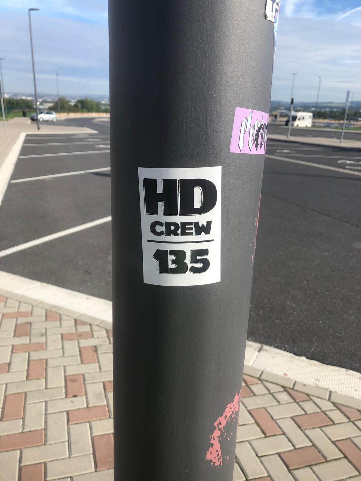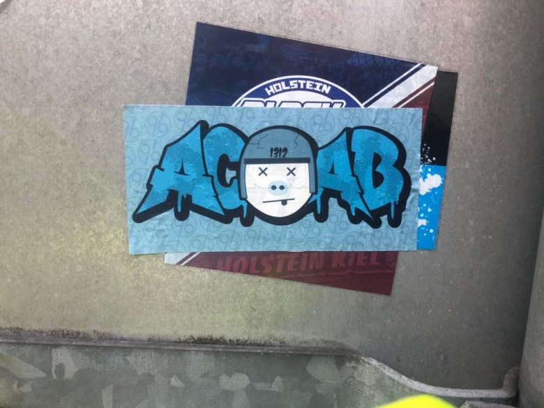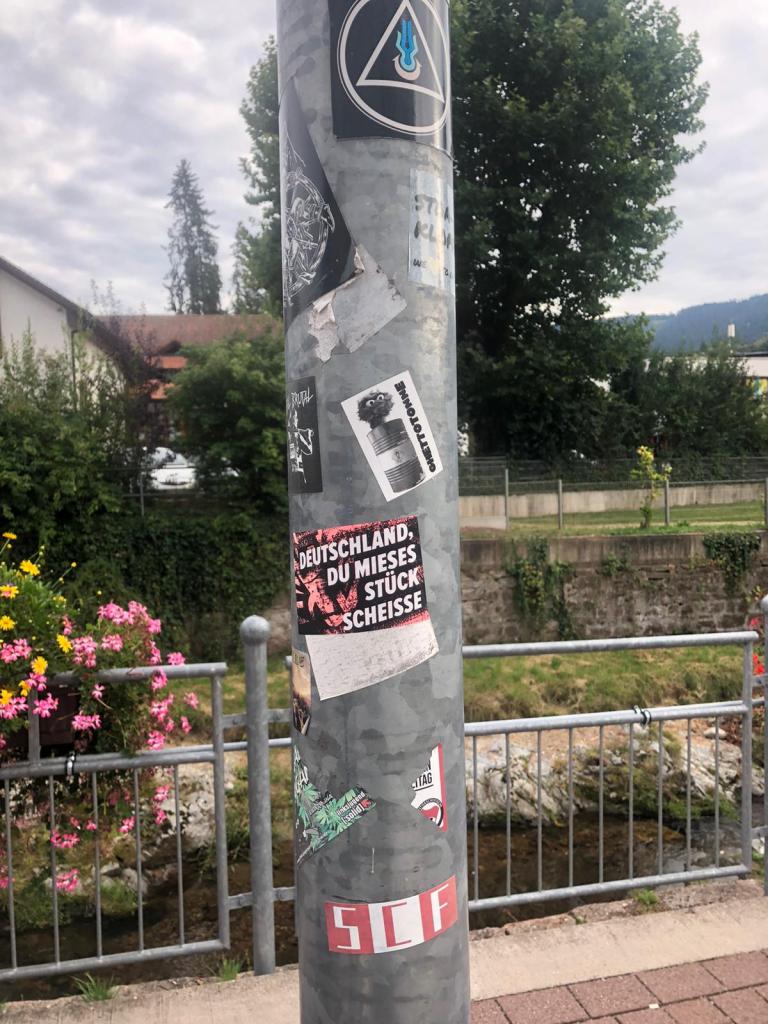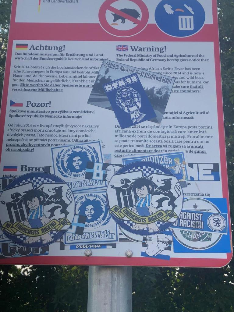 Parke in einer Parkbucht. Paar Meter weiter ein mit Bierball / Fußbier Sticker überklebtes Warnschild, iwas mit Schweine haben Pest…