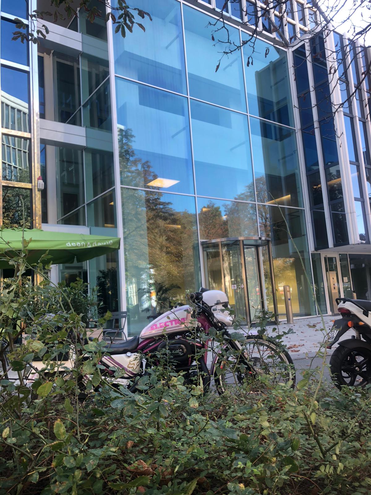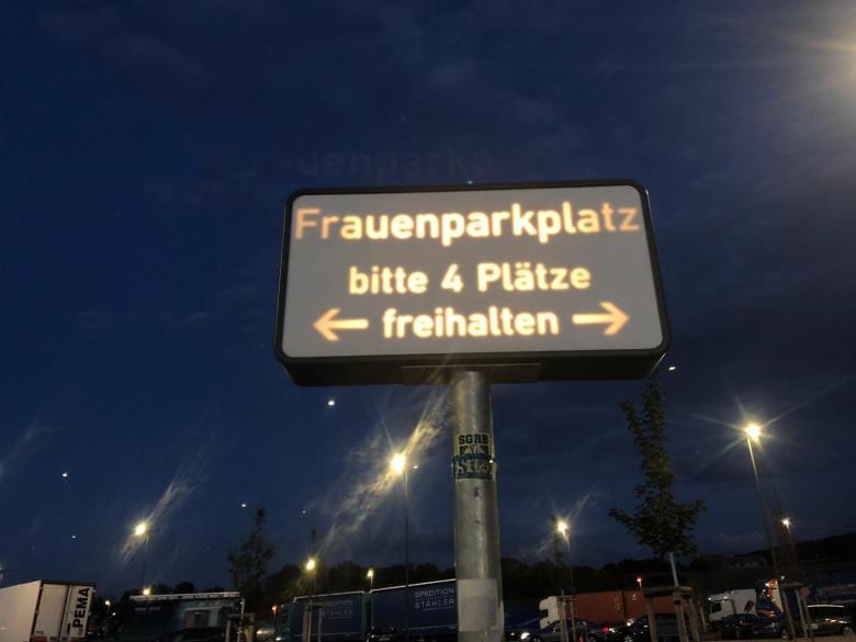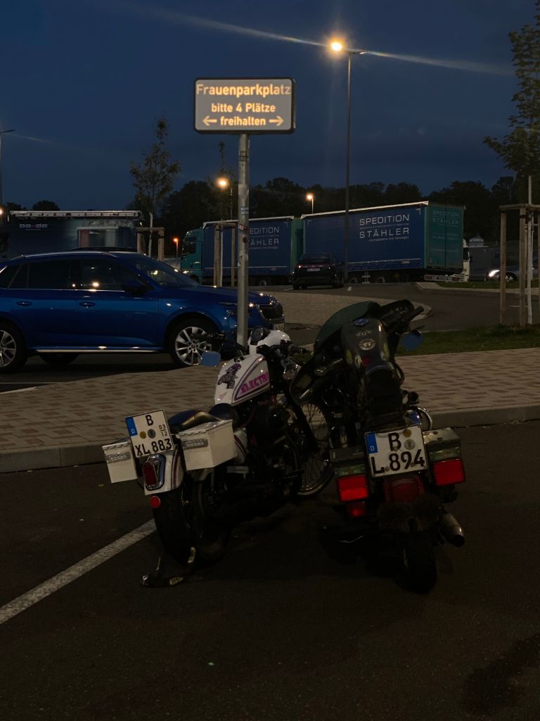 FRAUENPARKPLATZ… Als wir ankamen, war diese Leuchtreklame nicht zusehen… Egal beide Mopeds standen zu 50 % ordnungsgemäß.