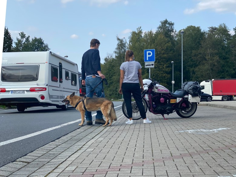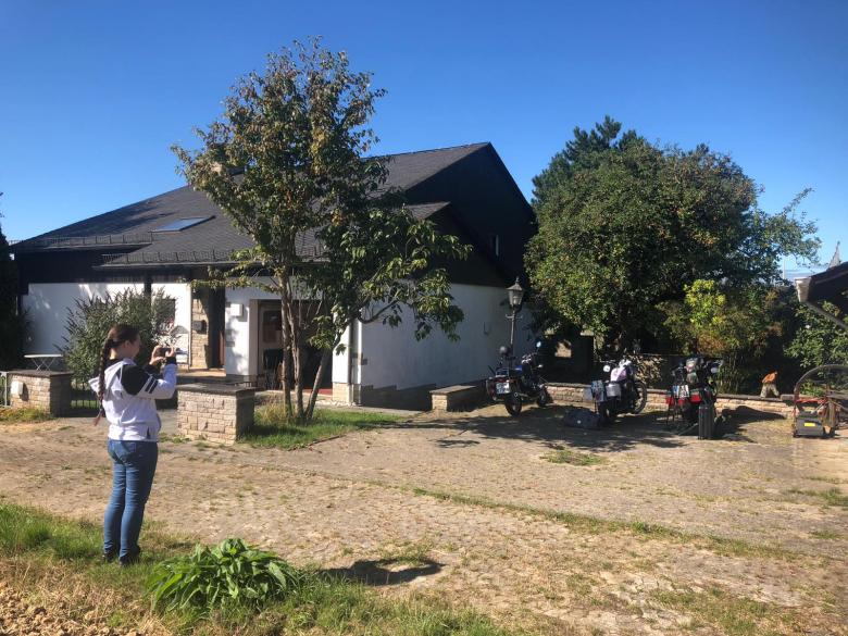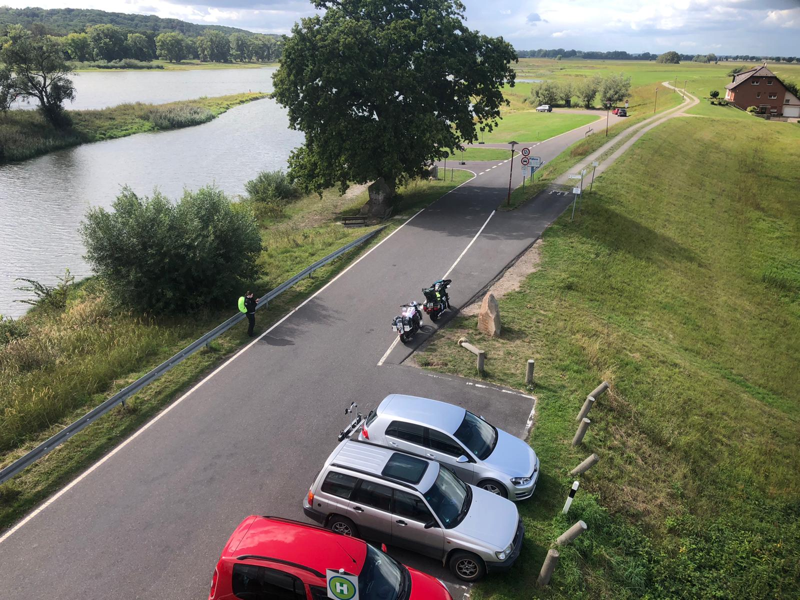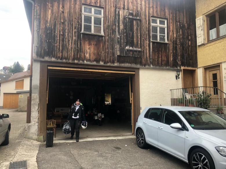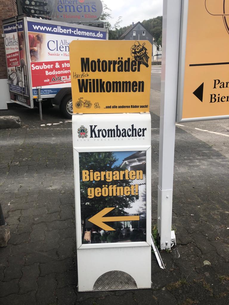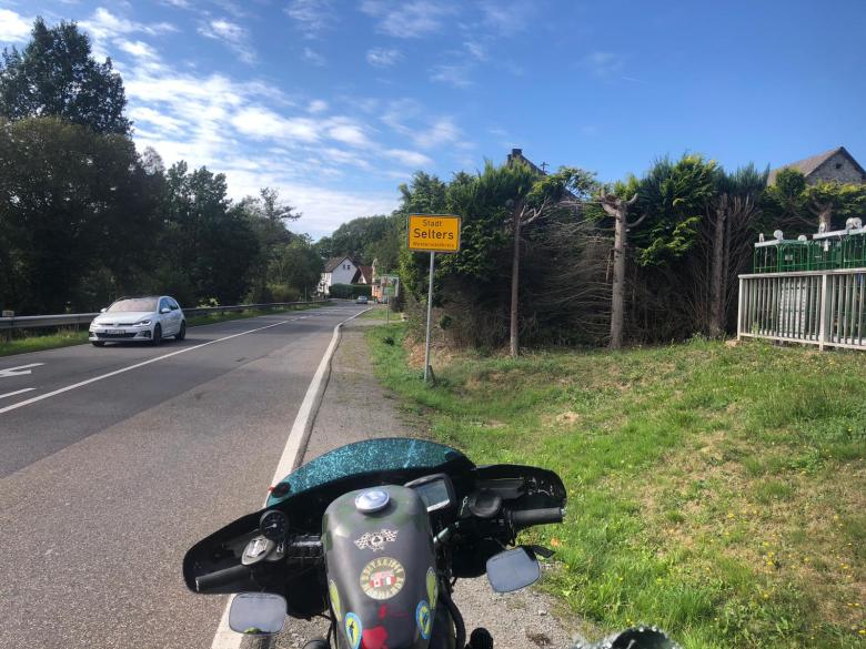 Wir erreichten Olpe, geplant war Jessie’s Onkel zu besuchen. Die beiden haben sich noch nie gesehen. Zuerst in einem Hotel eingecheckt. Dann uns auf die Socken gemacht Richtung meines Bruders. Jessie sagte mir noch: „Da tropft was bei dir.“ Aus’m Überlaufschlauch vom Vergaser, also Schwimmernadelventil hängt… Nicht das entsprechende Werkzeug dabei und auch kein Ersatzventil. Wenn es nur ein Dreckkrümmel ist, der am Ventil stört…. Also Hahn zu , Schwimmerkammmer leer fahren, Benzinhahn auf…und das Spiel mehrmals wiederholen. Vllt. spült die größere Menge einströmende Benzin den Dreckpfropfen weg?? Tschaggga, hat funktioniert. Bei der Adresse meines Bro angekommen, leider ist er nicht da. Aber in einer email schrieb er ja, daß er vlt. zu der Zeit wenn wir auf Tour sind auch auf Urlaubsreise ist…..